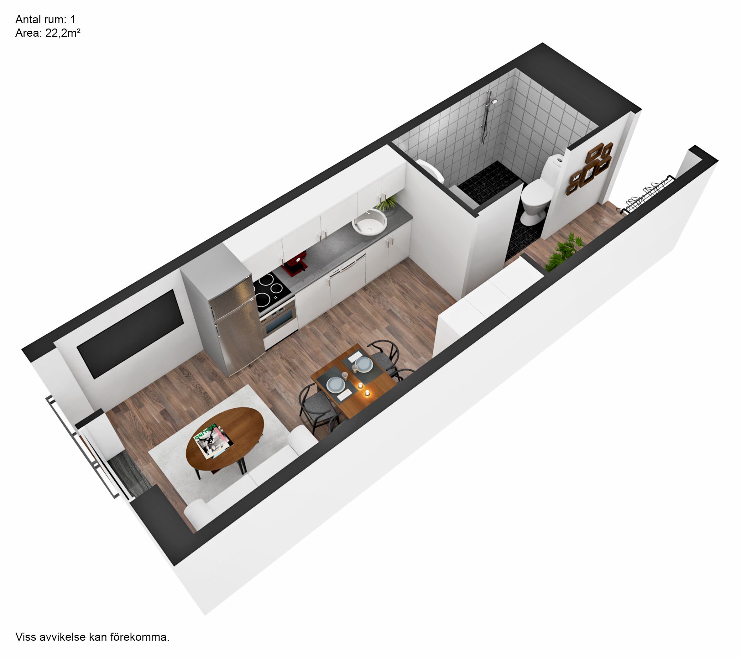 Den öppna och välkomnande planlösningen ger plats för både vardagsrum och sovdel, och köket är perfekt anpassat för både matlagning och sociala stunder. Det här är en lägenhet där du verkligen kan skapa ditt eget hem – precis som du vill ha det.