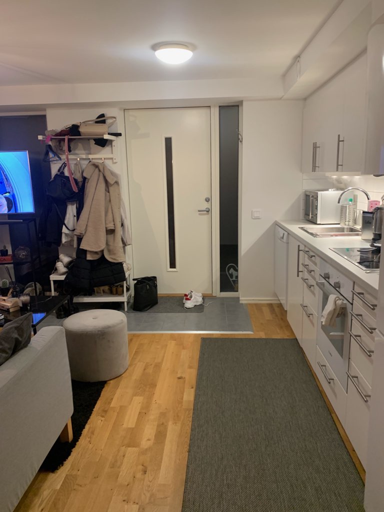 Parkettgolv genomgående. Kök med plats för köksbord. Kyl/frys i mindre storlek.