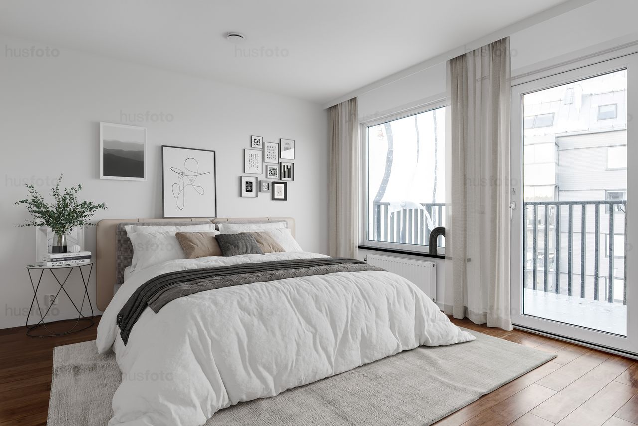 Lägenhet med uteplats. Lägenheterna har skönt ljusinsläpp med vita väggar och parkettgolv i bambu.