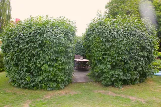 Huset har en stor trädgård med uteplats.