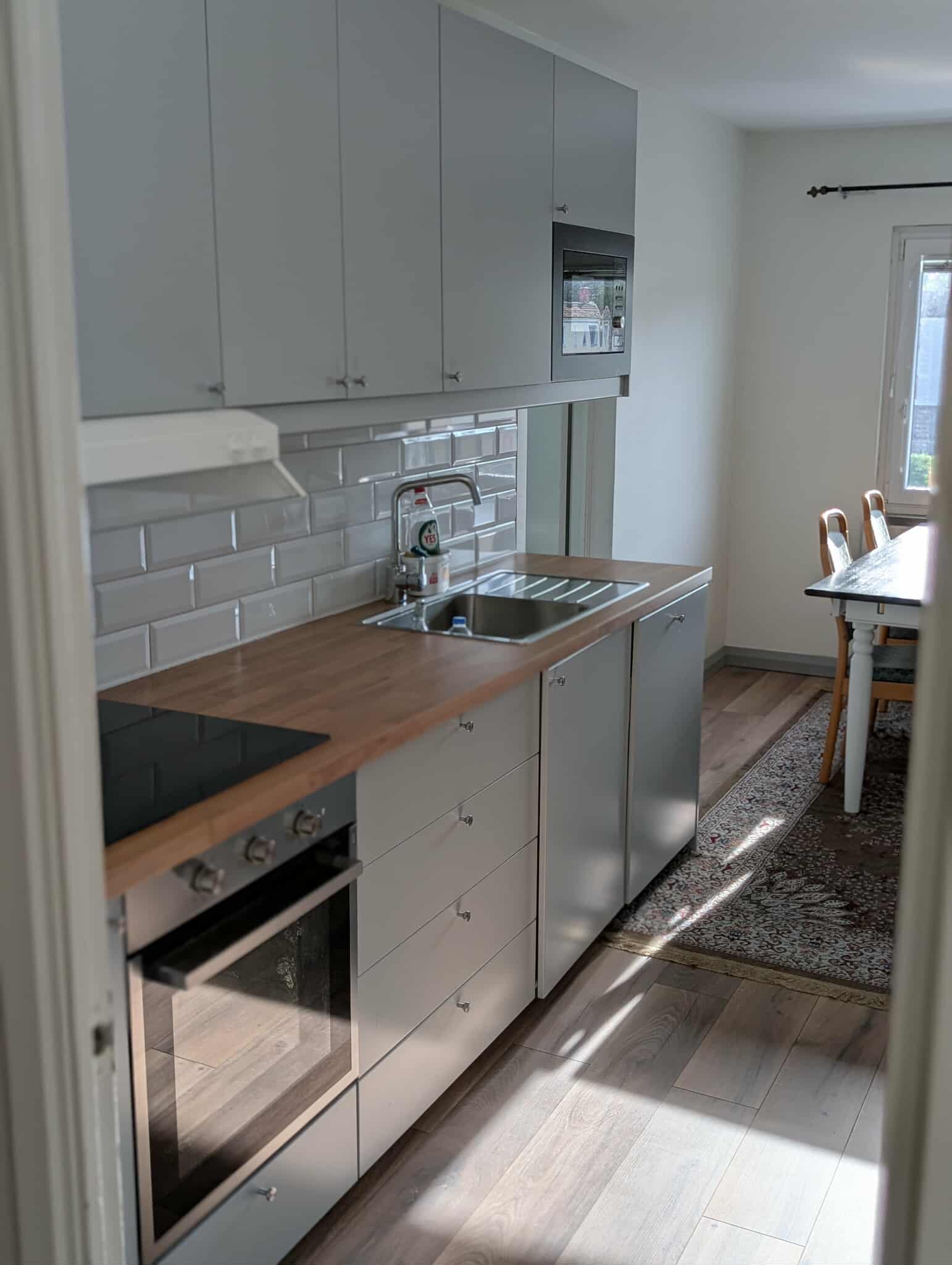 • Hållbara laminatgolv i ekmönster i hela lägenheten