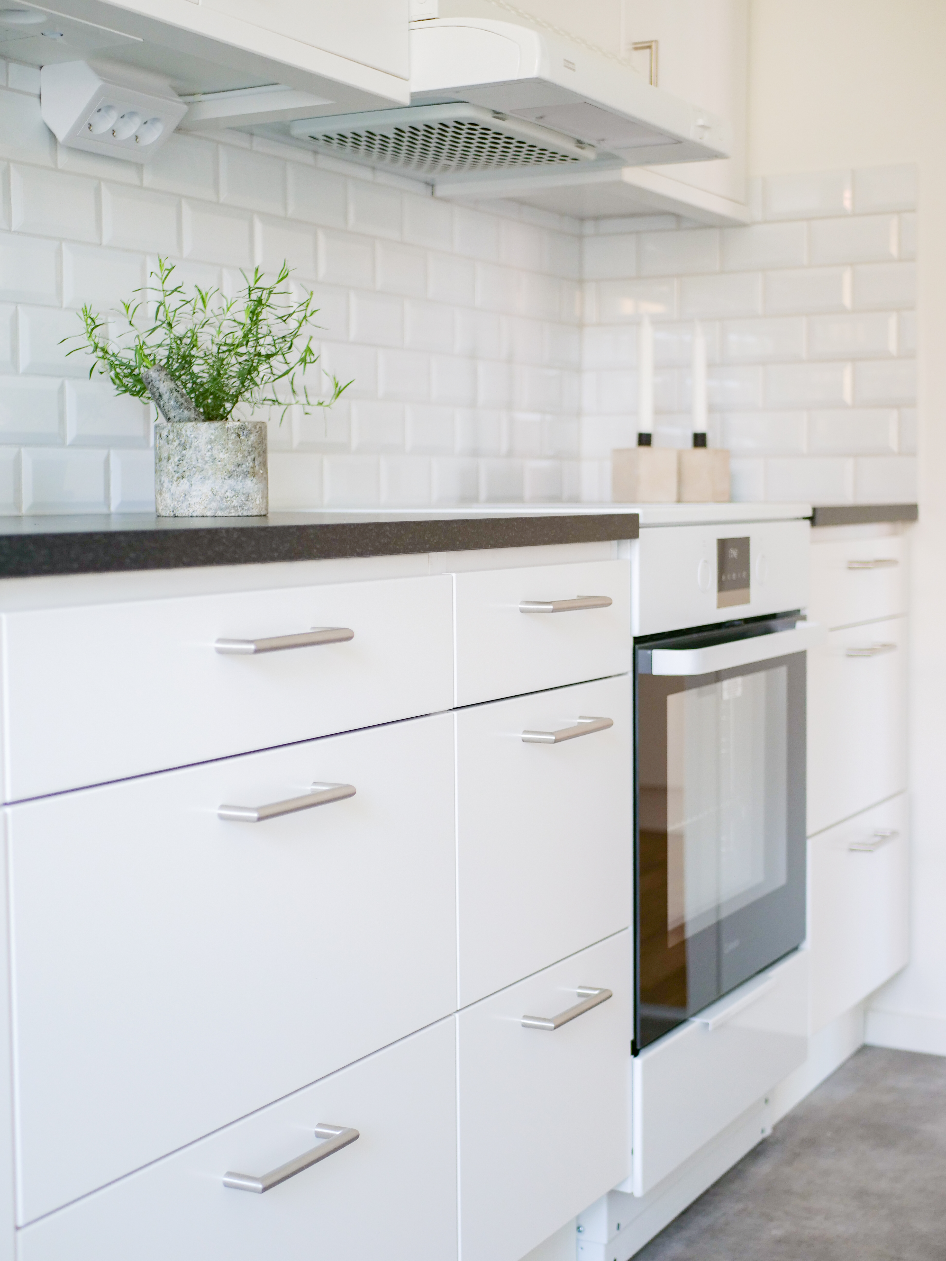 En trevlig ett rum och kök med genomgående ljusa ytskikt och modern touch.