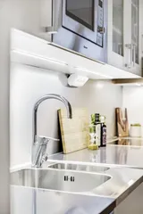 Bostäderna håller en genomgående hög standard med stilrena kök från HTH, bänkskivor i natursten och rostfria vitvaror. Alla rum har parkettgolv och varje lägenhet/radhus är utrustad med egen tvättmaskin för extra bekvämlighet.